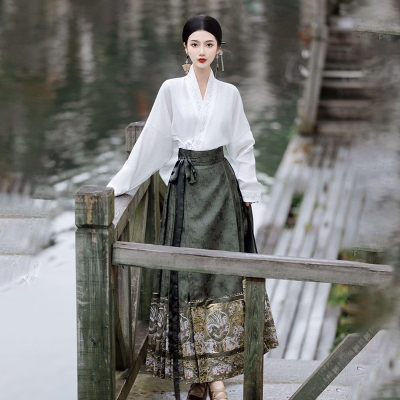 Một trong những cách để mặc Hán Phục Cách Tân mà không bị ‘dìm’ tuổi là kết hợp áo sơ mi với váy mã diện. Bộ trang phục này không chỉ mang lại cảm giác thanh lịch mà còn rất phù hợp với nhiều dịp lễ.